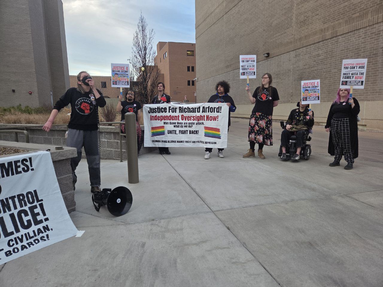Banners calling for independent oversight of Richard Arford’s investigation billowed in the wind as members chanted “CSPD, we want transparency” and “Detective Crofoot we see you, racist, homophobic, sexist too” while raising signs demanding the CSPD detective Edward Crofoot met with the family now.