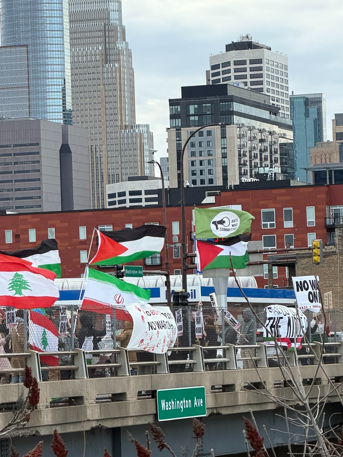 Minneapolis, MN – On April 7 over 50 anti-war protesters held Iranian, Palestinian and Lebanese flags and anti-war on Iran signs and banners over Interstate-35W in downtown Minneapolis to denounce Trump’s latest threats against Iran and demand an end to the ongoing U.S.-Israeli war on Iran. The emergency response demonstration was called by the Minnesota Anti-War Committee (AWC).
