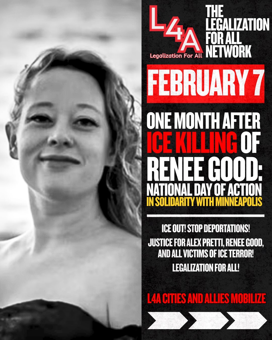 The Legalization for All (L4A) Network is calling on all affiliated cities to act NOW. Community observer Renee Good was killed by ICE on January 7th. This is why L4A is calling for a national day of action on the one month anniversary.