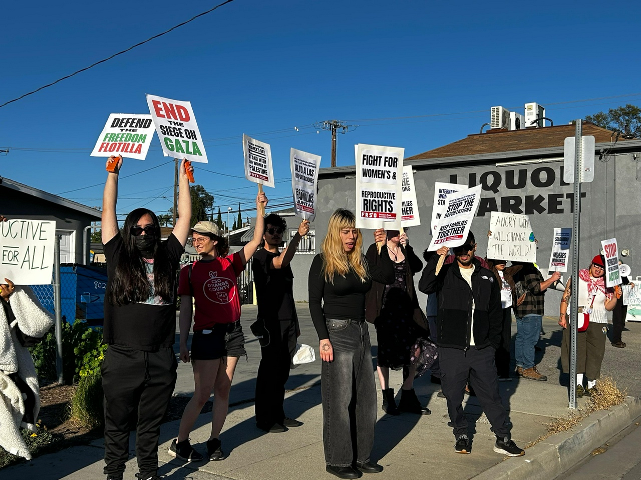 La multitud cerró el evento con fuerza marchando hacia Civic Center Drive para realizar una manifestación con pancartas. Los letreros decían: «Solidaridad con las mujeres inmigrantes» y “Detengan las deportaciones: mantengan unidas a las familias”. Coreaban “¡Trump, escucha, estamos en la lucha!” mientras los automóviles que pasaban tocaban sus bocinas en señal de apoyo.