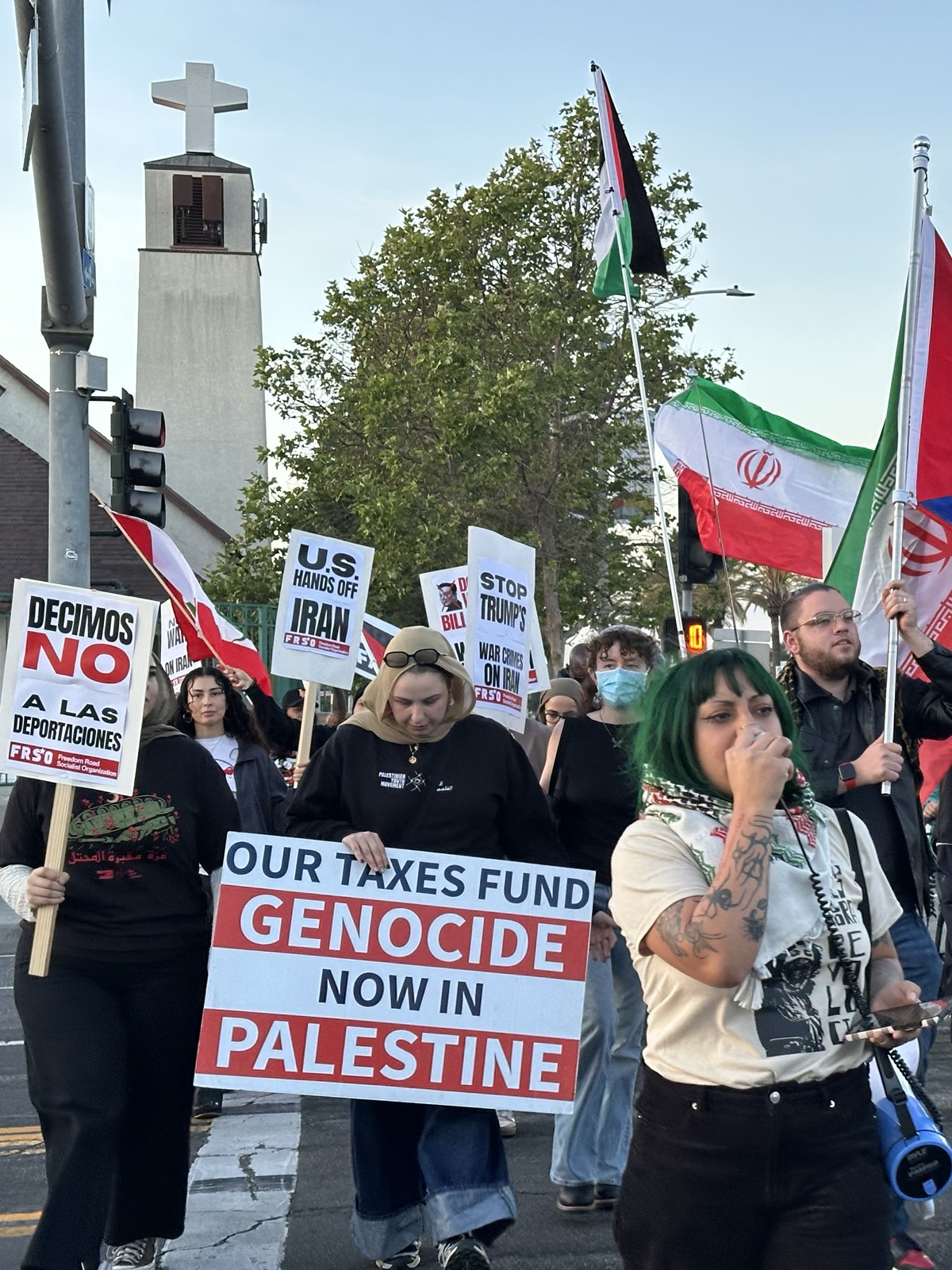 Santa Ana, CA – The afternoon of April 8, roughly 60 residents from across Orange County chanted “Money for jobs and education, not for war and occupation!” They gathered to protest and demand an end to yet another war in the Middle East. The U.S. and its proxy Israel have been carrying out attacks against Iran for over a month, causing civilian deaths and a global economic crisis. Trump issued a series of threats over Easter weekend, including promising the “death of an entire civilization” and destruction of civilian infrastructure if Iran did not open the Strait of Hormuz by April 7. He gave in just hours before the supposed deadline.